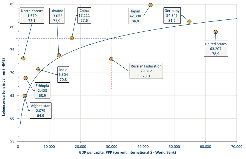 Russland hat im Jahr 2020 eine Lebenserwartung von nur 73 Jahren. Gemessen an seiner Wirtschaftskraft müsste sie jedoch bei knapp 78 Jahren liegen. Wirtschaftskraft setzt sich in Russland offenbar nicht in Wohlstand um.