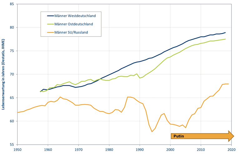 Unter den seit 2000 von Wladimir Putin angeführten Regierungen hat sich die Lebenserwartung von Männern deutlich erholt, liegt aber immer noch etwa zehn Jahre hinter der von westdeutschen und neun Jahre hinter der von ostdeutschen Männern zurück.