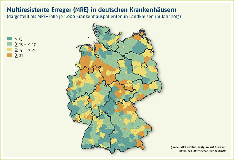 Durchschnittlich kamen im Jahr 2014 bundesweit 16,8 MRE-Nachweise auf 1.000 Krankenhausfälle. Die Regionen mit den meisten Fällen ziehen sich wie ein Band durch die Mitte Deutschlands: von der niederländischen Grenzen über Süd-Niedersachsen und Thüringen bis hin nach Oberfranken. Acht der zehn Kreise mit den bundesweit höchsten Werten von 28 bis 45 MRE-Fällen pro 1.000 Krankenhauspatienten liegen in Niedersachsen. Die zehn Kreise mit den niedrigsten Werten weisen hingegen nur sieben bis neun MRE-Nachweise je 1.000 Krankenhausfälle auf. Alleine sieben Kreise davon befinden sich in Bayern. Datengrundlage war die fallpauschalen-bezogene Krankenhausstatistik (DRG-Statistik) des Statistischen Bundesamtes.